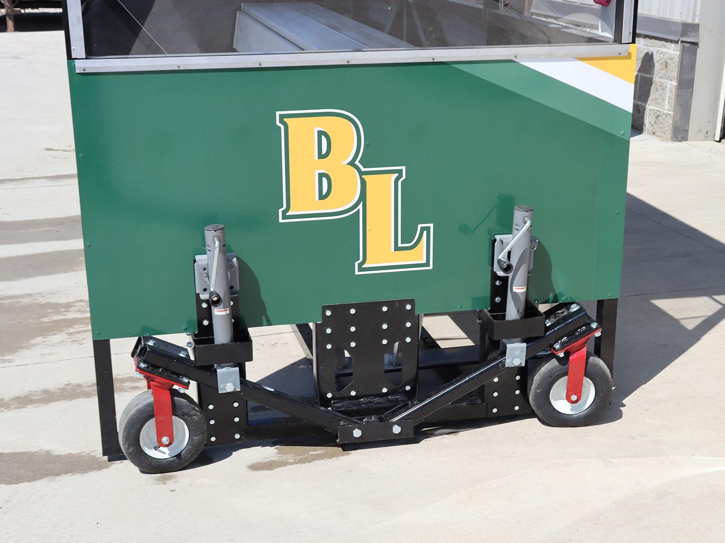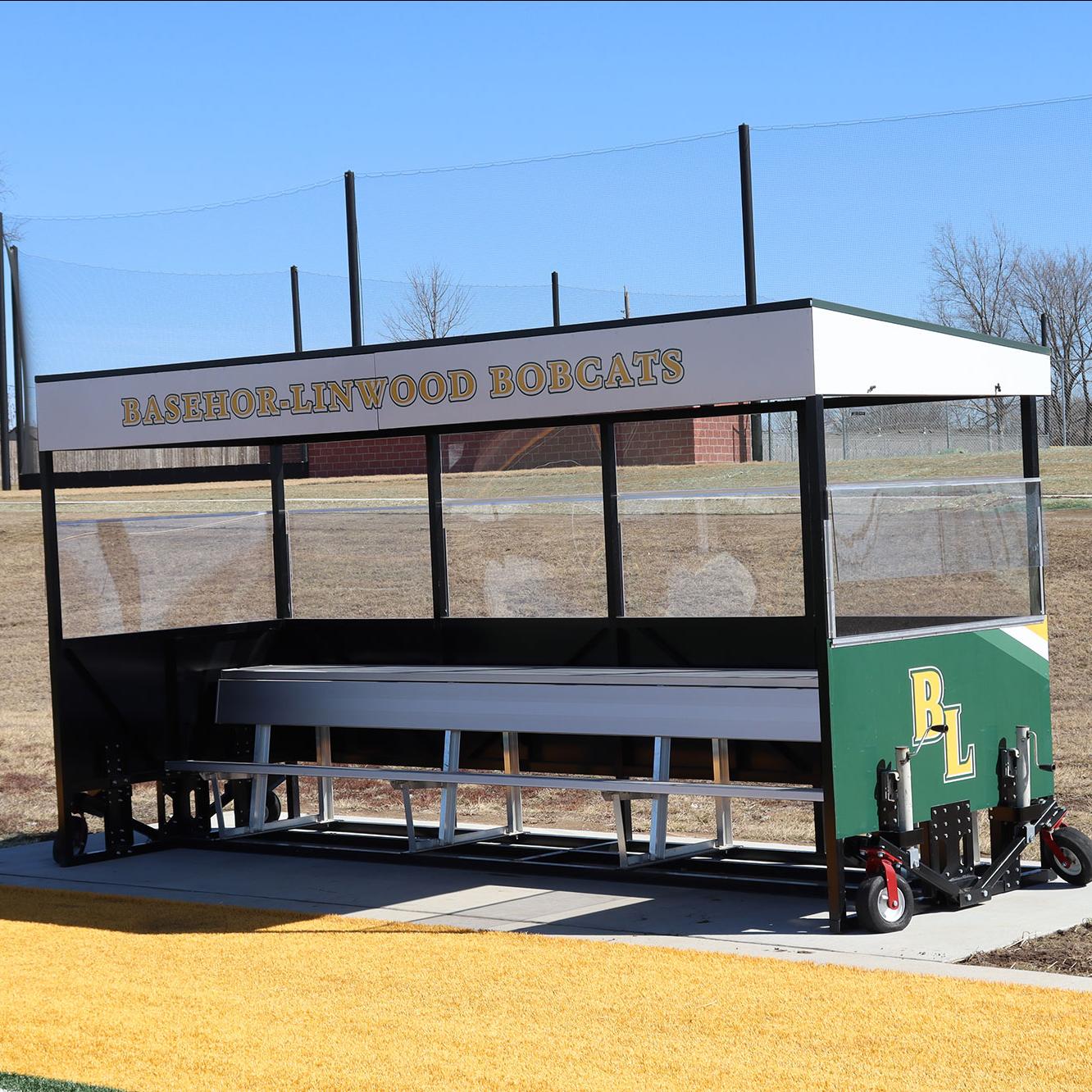 - Frame finished with Industrial Tnemec pain and wrapped in team graphics. Roof and trim options offer many color choices to complement the color scheme of the frame. Equipped with an aluminum team bench with a double plank shelf for extra seating and storage.